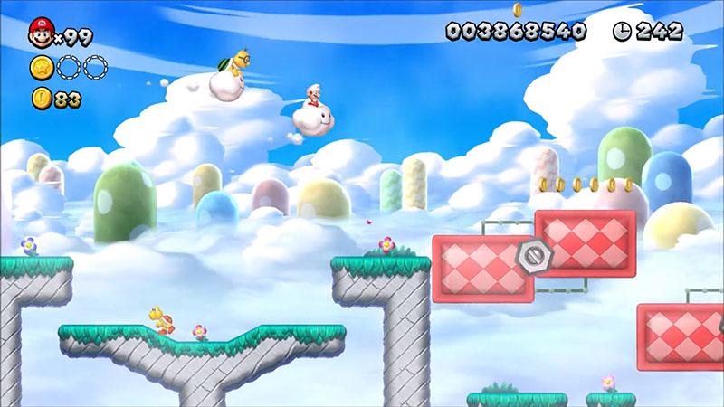 2009年発売の『New スーパーマリオブラザーズ Wii』以降は、踏みつけで倒しても雲が残るようになり、隠されたルートやアイテムを見つけるギミックに使われることが増えてきました。